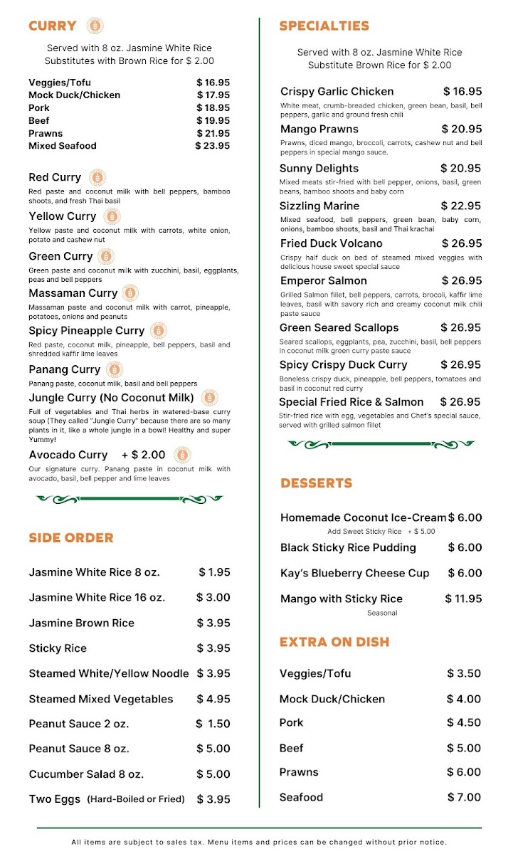 Kay Thai Eatery boasts an enticing menu, featuring standout offerings like the aromatic Massaman curry and the comforting Khao Soi with seafood. Customers rave about the freshness of the ingredients, with highlights including garlic chicken and paradise Rama. Don’t miss out on the homemade coconut ice cream—a perfect sweet ending to your meal.